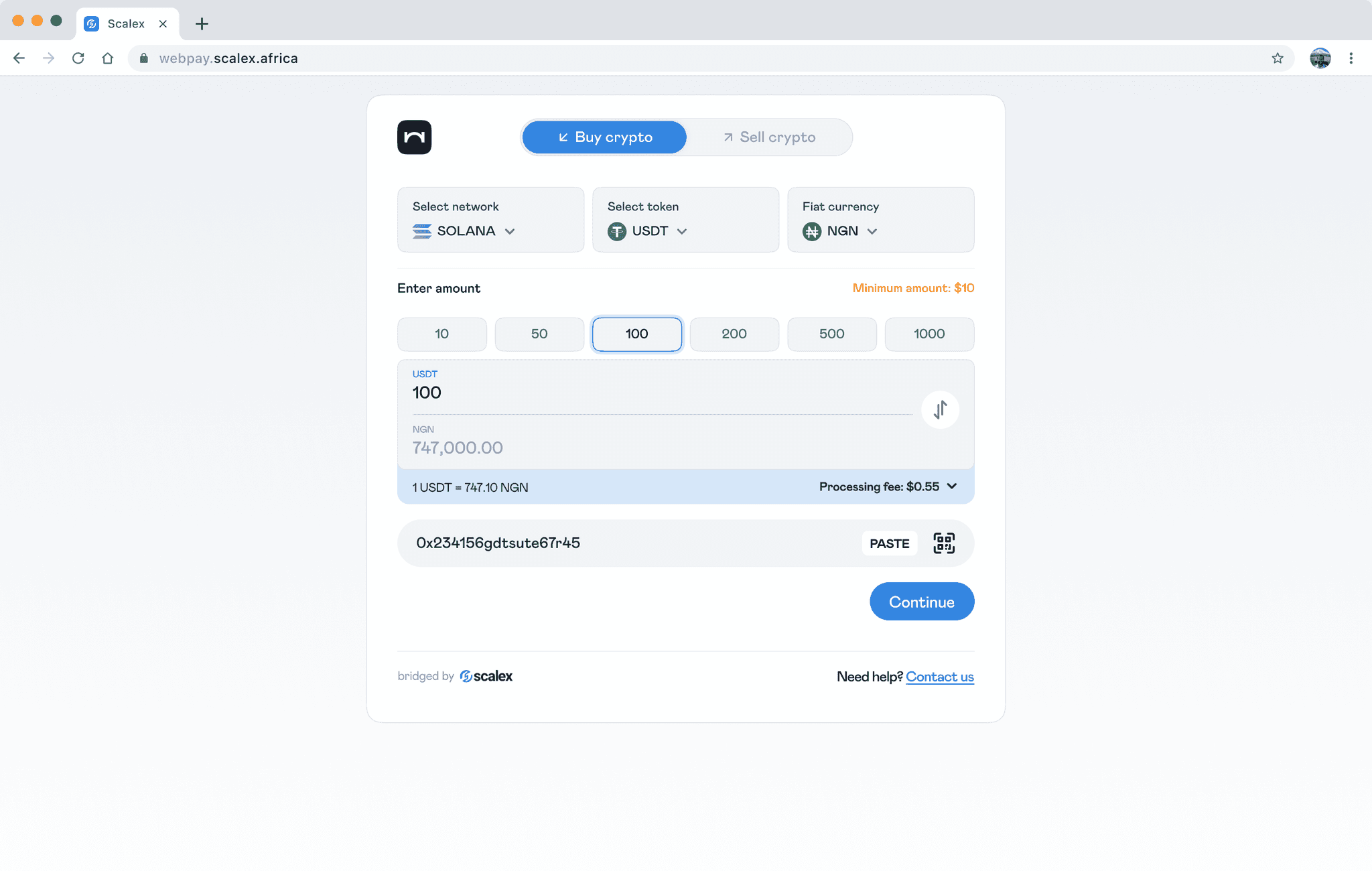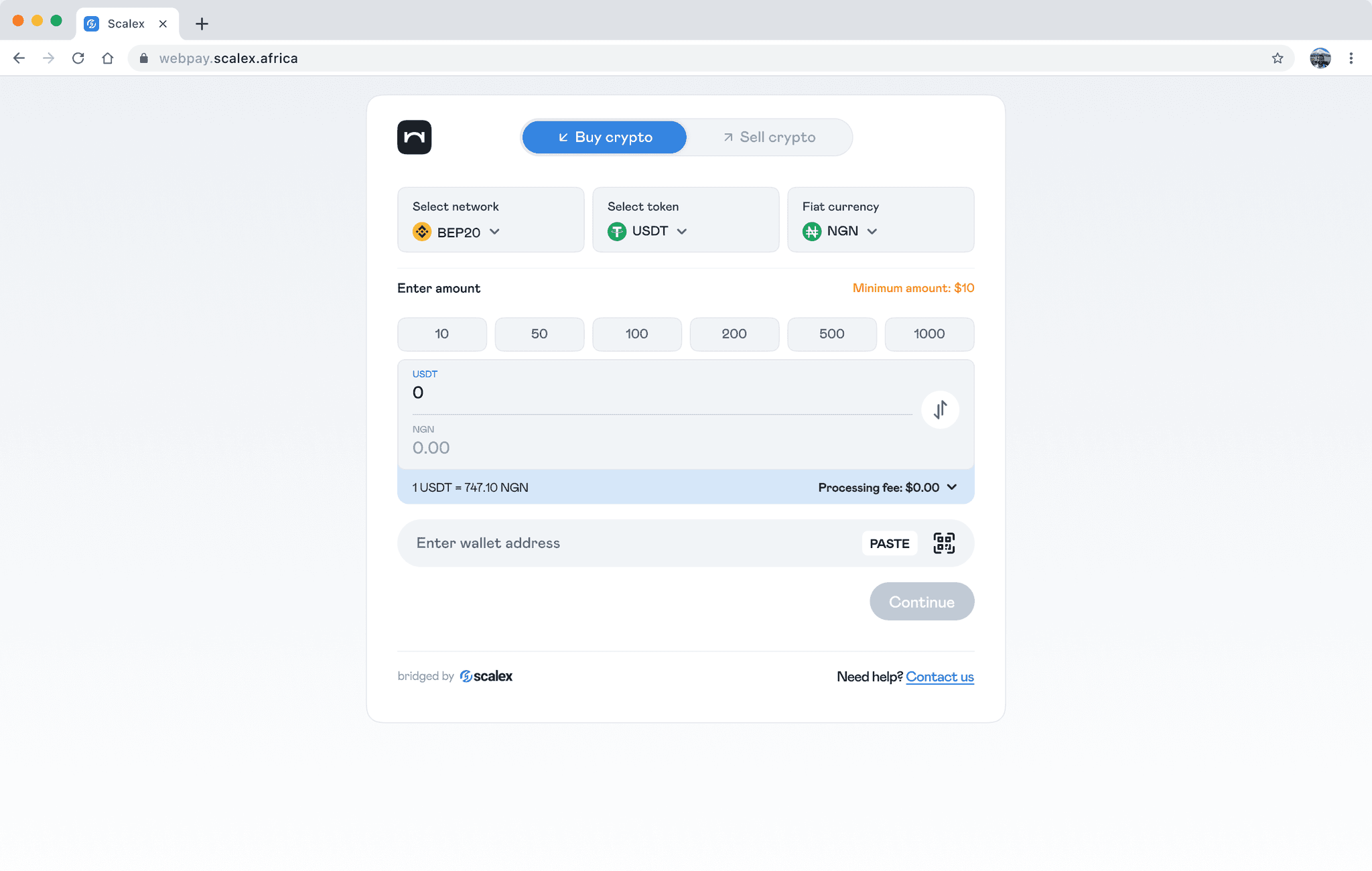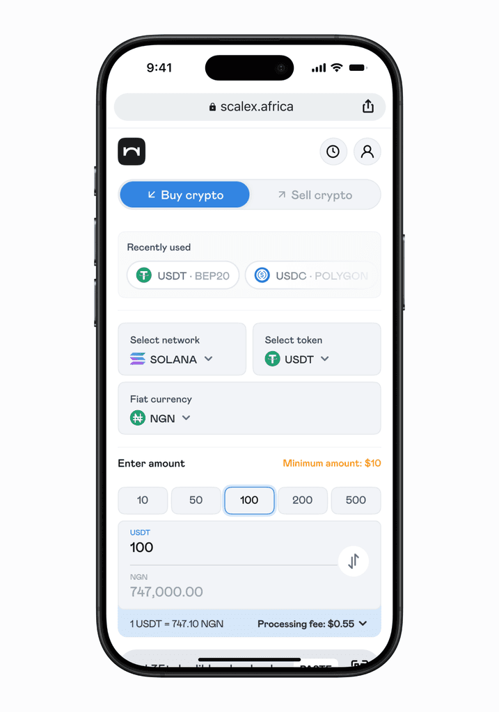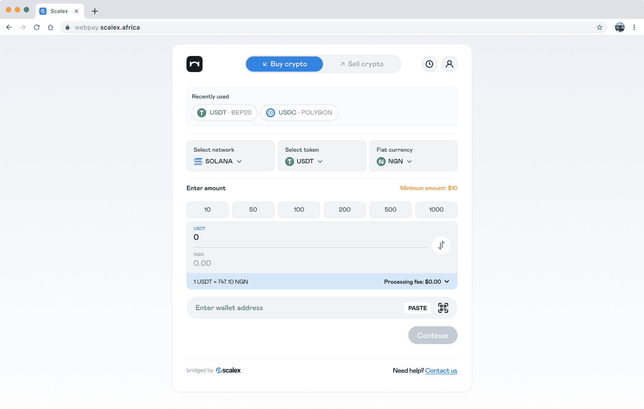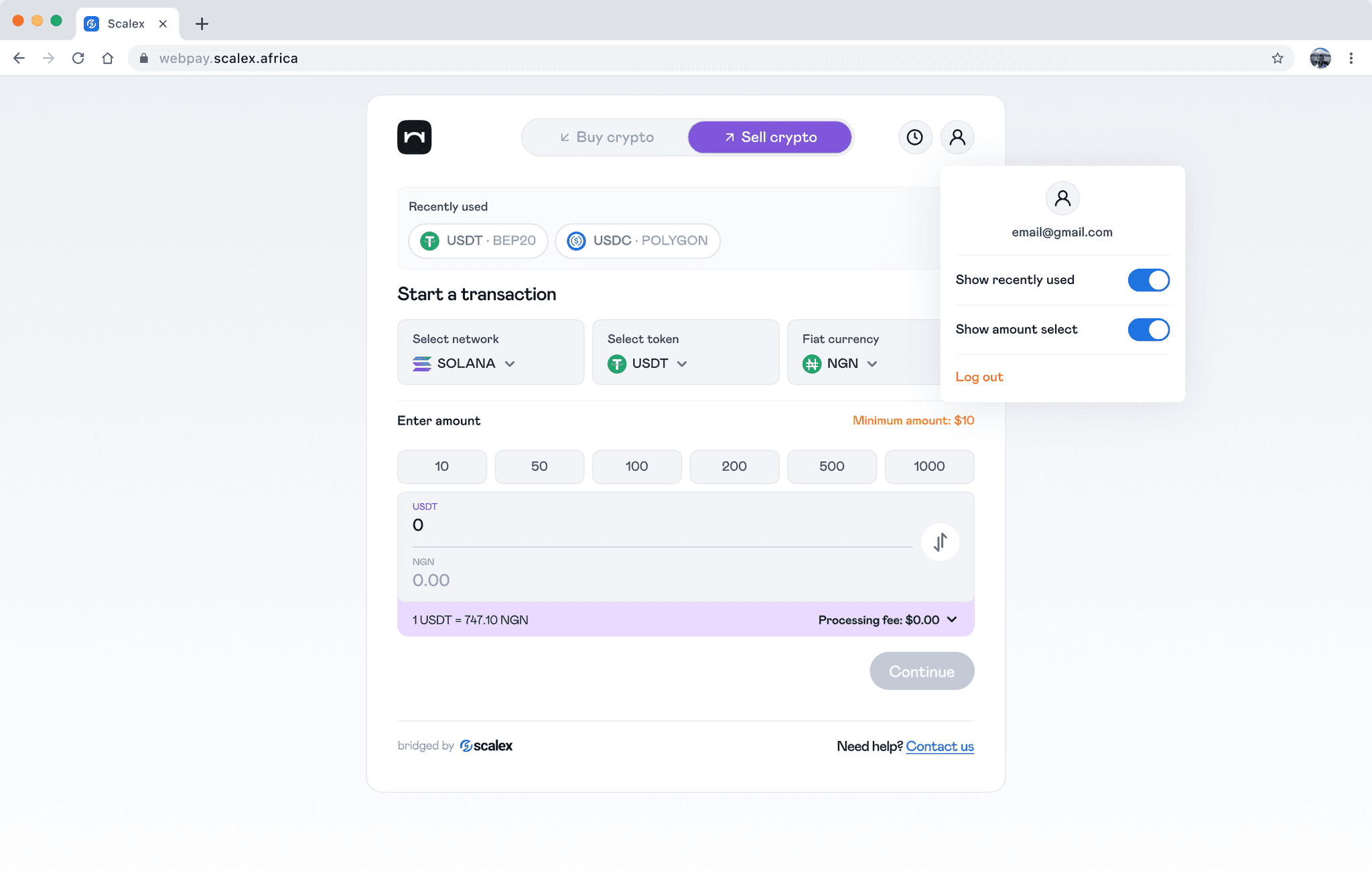 Checkout is a web app powered by Scalex where users can swap stablecoins (USDC and USDT) to fiat.